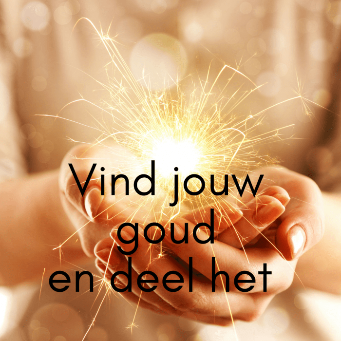 Dus durf op zoek te gaan naar jouw goud. Check eens bij mensen in je omgeving, vrienden, collega's, collega-ondernemers wat zij denken dat jouw goud is. Het gaat je zoveel opleveren als jij jouw gift met anderen deelt en zij hun goud met jou delen. Stel je voor hoe rijk we kunnen worden als we ons niet meer verschuilen achter de angst om te delen, om te gaan staan voor wat we te bieden hebben. Door onze verhalen te vertellen aan wie het maar wil horen. Want delen is vermenigvuldigen.